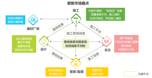 家装涉及到多个流程和环节的存在,每一个环节的缺失都有可能造成其他其他流程和环节的无法继续推进。家装市场产业链涉及的主体有建材家居工厂、家装公司、设计师、施工队、管家和业主等,整体服务链条过长,不仅拉高了用户端的价格,而且使得沟通成本增加、信息流通存在阻碍。具体而言,在装修过程中,落地效果主要由施工方呈现,施工现场突发情况多,工头需要及时和设计师、管家、业主沟通,协调多方信息。此外,家装市场还存在规模化、标准化程度低、管理模式落后等通用问题,最终导致用户家装体验差成了家装市场最常见的状况。数字化转型将赋予企业新的使命与价值,打造无忧家装,提升业主信任度让家装行业焕发生机。