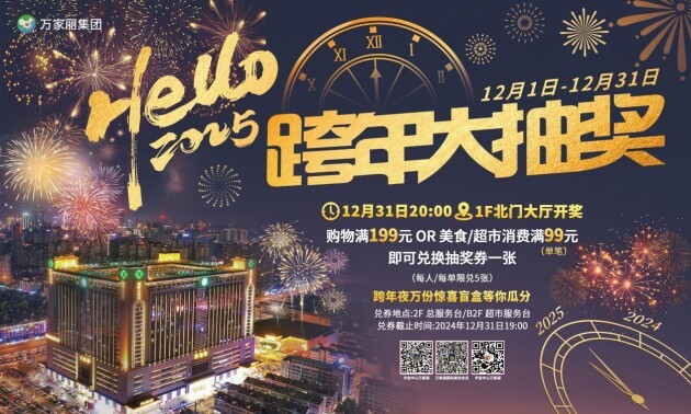 “Hello 2025”跨年大抽奖惊喜来袭,即日起至12月31日,在商场购物单笔消费每满199元/美食满99元,即可至2F服务台兑换抽奖券;在超市消费满99元,即可至B2F超市服务台兑换抽奖券。12月31日在万家丽国际MALL1楼北门20:00开奖,送出黄金饰品、品牌手机、超市购物卡、豪华客房体验券等超多惊喜豪礼,还将派发2025年第一份宇宙惊喜盲盒礼,为市民和游客带来最超值的跨年体验。
