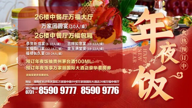 岁末终章逢盛宴,人间至味是团圆。万家丽国际大酒店匠心推出臻享年夜饭,超值预售1888元起,多款年夜饭套餐火热预定中。一流专业大厨精心烹煮数道珍馐佳肴,团圆心意尽在这一席美味盛宴之中。即刻预订尊享多重福利,免费参与贵州茅台酒、自制梅菜扣肉等豪礼抽奖,每桌赠酒水饮品、果盘餐点和全家福拍立得照片一张。万福中餐厅打造全家齐乐的团聚时光,28个特色包厢及大厅可供选择,用餐环境高雅,为您呈现缤纷美馔。酒店餐饮预订热线:0731-85909777、0731-85909776。