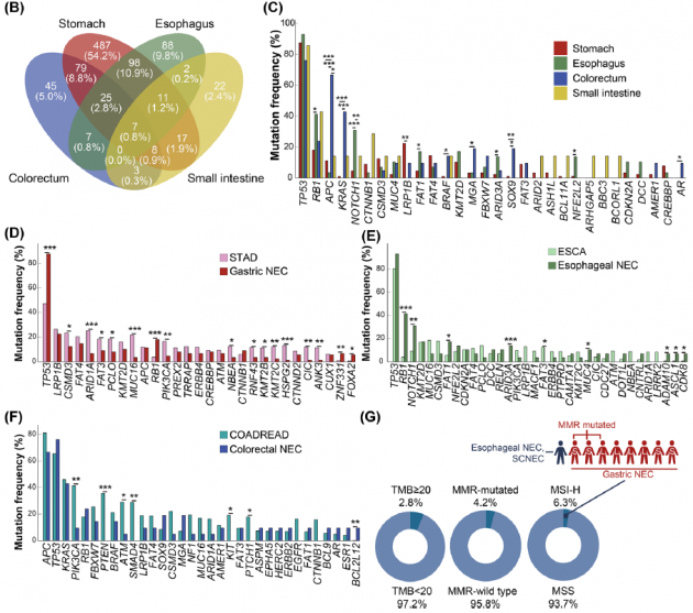 鉴于潜在的遗传相似性,使用GI-NEC中不同解剖部位(胃、食道、结直肠和小肠)对应的非NEC肿瘤(胃腺癌、食管癌、结肠癌和直肠腺癌)的TCGA数据进行比较分析。结果发现,食管NEC和食管癌都出现极高的TP53突变频率,组内突变频率前三的APC、TP53和KRAS在结直肠NEC和结肠癌间无组间差异,但也存在突变频率出现组间差异的部分基因,这表明同一部位的GI-NEC和非NEC之间呈现不同的基因突变景观(图1D-F)。此外,鉴于GI-NEC的组织学标准参考肺部肿瘤,故将GI-SCNEC和GI-LCNEC的突变谱分别与SCLC和L-LCNEC进行了比较分析,也观察到类似的结果。