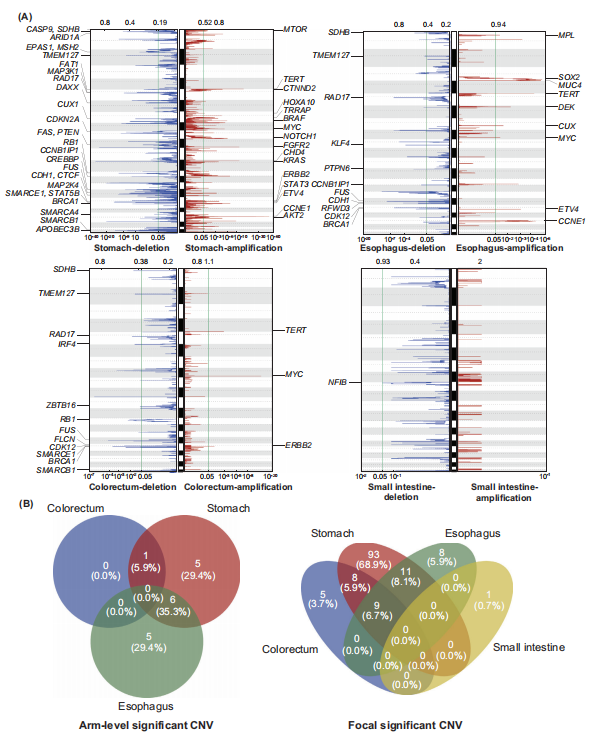 在体细胞 CNV 的分析上,染色体19q12(CCNE1)在胃和食管NEC中显著扩增, 17q12(ERBB2)在胃和结直肠NEC中显著扩增,8q24.21(MYC) 在胃、食道和结直肠 NEC 中显著扩增。同时,胃肠道不同部位的NEC也存在较多具备部位独特性的CNV扩增和缺失特征,这进一步表明胃肠道不同部位的NEC在CNV特征上存在一定的共享性,但也存在较大的异质性(图3A-B)。