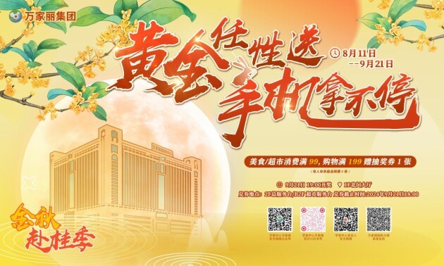 中秋嘉年华,金礼大放送。即日起至9月21日,全场购物单笔消费满199元/美食满99元,即可至2F服务台兑换抽奖券;在超市消费满99元,即可至B2F超市服务台兑换抽奖券;9月21日19点开奖,黄金饰品、品牌手机、豪华客房券、大牌美食券等百万豪礼送不停。“金秋赴桂季·幸运宇宙人”大抽奖带你一夜暴富!
