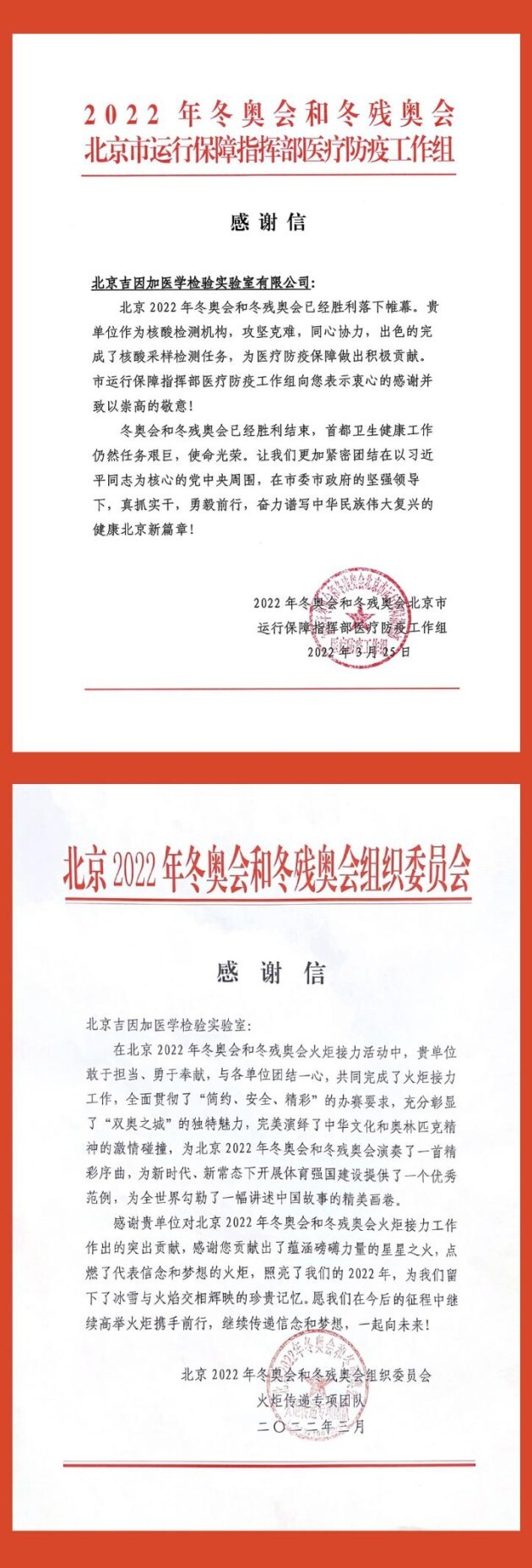 双奥逢盛世,一起向未来。北京2022年冬奥会和冬残奥会圆满落幕,一幕幕华彩动人的画面汇聚成为生动的奥运精神,深刻烙印在冬奥历史之中!在严密高效的疫情防控策略中,北京冬奥会防疫措施交出满分答卷!吉因加作为入选北京冬奥会的10家核酸检测机构之一,赋能奥运,用责任守护“双奥之城”,用情怀书写 “冰雪答卷”,收获了来自冬奥会北京市运行保障指挥部医疗防疫工作组及北京冬奥会及冬残奥会组委会的感谢、表扬和点赞。
