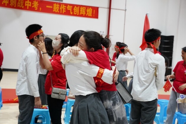 最后——家长与学生互换书信。孩子给家长九十度鞠躬。家长为孩子佩戴一实校徽,系上“中考必胜”祈福手链。随后,家长与孩子携手走过成功门、状元门,并在目标墙上签名。