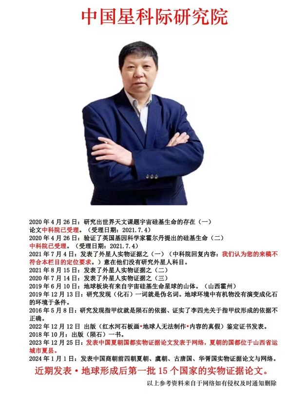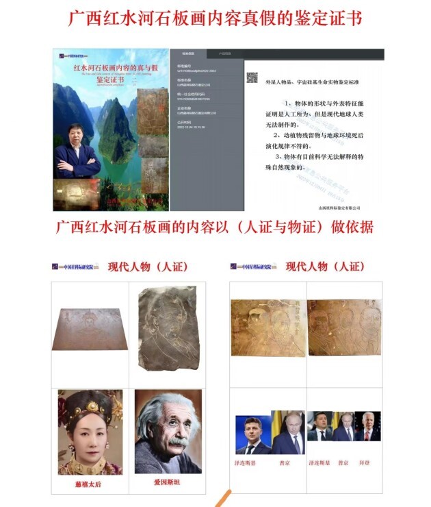 三 、 中 国 星 科 际 研 究 院 根 据 (外 星 人 物 品 、 宇 宙 硅 基 生 命 实 物 鉴 定 标 准 Q/141000SXXKJDHS2017-2020. )对石板画内容真假的鉴定 。根据反推理逻辑得出以下结论: 石板画的内容没有虚假的,是真实存在的, 由此可见石板画是证明中国历史(乃自世界历史)朝代演变的实物证据。