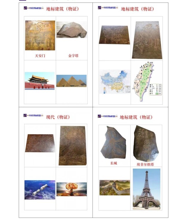 根据以上石板画的内容 ,现代人物画像作为人物证 据 。地标建筑物、 中国地图作为物证 。经研究发现 ,现代人物 ,地标建筑与石板画内容高度一致。