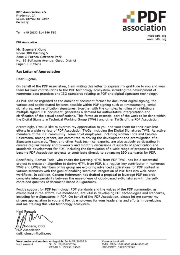 近日,国际PDF协会向福昕软件发来感谢信,盛赞福昕软件多年来对PDF技术生态系统做出的重要贡献!这些贡献包括开发和维护与PDF、数字签名相关的技术及ISO标准。