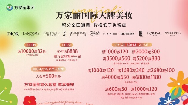 临近新春佳节,妆容也要焕然一新!万家丽国际大牌美妆礼遇新春,1月5日—1月7日 1月12日—1月14日、1月19日—1月21日、1月26日—1月31日、2月1日—2月17日,DIOR、LANCOME、雅诗兰黛,满1000减120、满2000减300、满3500减560、满5200件880,YSL满1000减120、满1680减240、满2680减400、满4000减650、满6880减1180,植村秀、科颜氏、MAC、Biotherm、羽西,满600减50,满1000减120,1月1日—2月14日,兰蔻消费满一万,直接82折,更多满减折扣欢迎进店详询,美妆新会员注册,享升级礼遇!消费满额赠送豪华客房体验券,尊享VIP贵宾休息室,高端购物管家服务、VIP专属免费停车位、精致茶歇、WIFI、爱心租借服务、不定期高端会员沙龙、购物寄存服务......更多美妆福利,等你到店解锁。