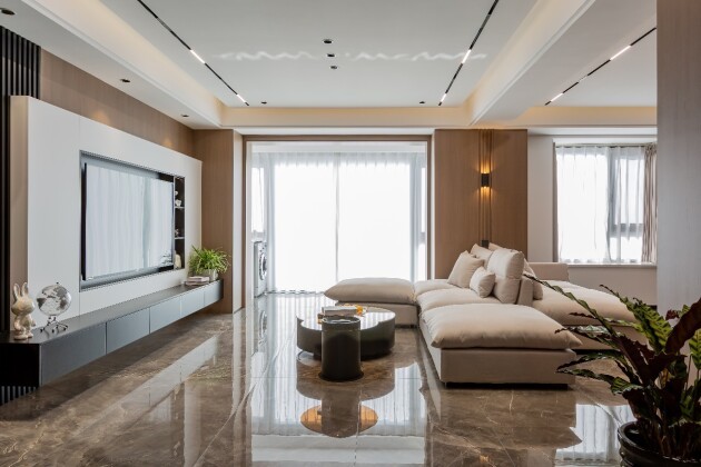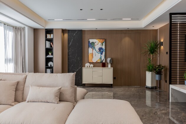 空间的整体基调以大地色系为主调,挖掘木饰墙面收纳艺术,软装以科技布沙发搭配圆弧形组合茶几,使空间呈现简朴大气的沉静气质,营造温柔含蓄的感觉。