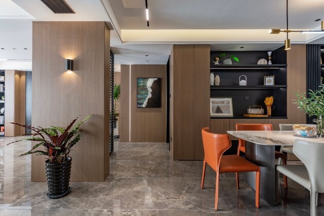 走廊是公共空间与私人区域的过渡,大面积的木饰面与地面陶瓷大板混搭碰撞,自然与时尚交互堆叠,冷静的简约空间多了一份温润优雅。