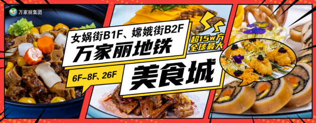 中国美食看长沙,长沙美食看万家丽,15w平方米全球最大地铁美食城,连吃1年不重样。万家丽女娲街(B1F)、嫦娥街(B2F)拥有各种特色小吃,六楼七楼八楼聚集上万种网红大牌美食,本土湘菜排队王、火爆全国的东南亚料理、地道四川火锅、风靡全国的韩式烤肉……在宇宙中心万家丽迎接新年,你可以一站式打卡全球美食,更有美食直播/专栏不定期放送免单福利。给新年100分的仪式感,来万家丽用美味共庆团圆,留住此刻的美好!