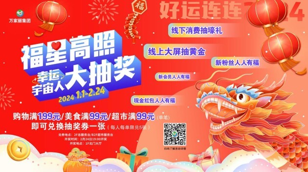 1月1日-2月24日,万家丽倾情打造福星高照幸运宇宙人大抽奖!在万家丽国际购物广场全场单笔消费满199元,美食类单笔消费满99元,万家丽生活超市消费满99元,商场指定品牌任意购买两份甜品,均有机会赢取黄金饰品、品牌手机、超市购物卡、豪华客房券、大牌美食券等重磅福利。2月24日活动当天,万家丽粉丝群抽大牌无门槛美食券;新用户注册万家丽美妆会员,凭任意消费小票,即可获得暖冬礼包一份;关注“万家丽国际MALL”微信公众号,更有三轮现金红包雨大派送……超多钜惠礼遇,一起在万家丽掀翻狂欢热潮吧!