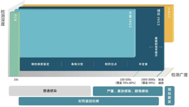 而基于探针捕获的tNGS,可以通过其稳定性好、准确性高、可拓展性强等优势,完美解决了以上三个需求,可实现难检病原的高灵敏检出、耐药检测精确到位点,同时可实现毒株分型和半定量等功能,补充PCR检测广度,mNGS检测深度及精度的局限性,对tNGS技术进行了再定义。