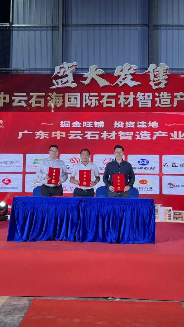遥遥领先!非凡“智造”!石都倾力之大项目——中云石海闪耀世界,董事长关海棠与入驻企业广东石海美家建材、云浮市硕城石业、云浮市欧豪石材、云浮市小石头网络科技现场签约。