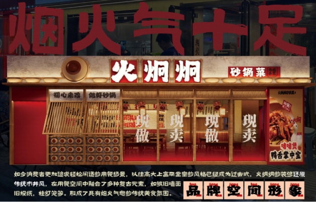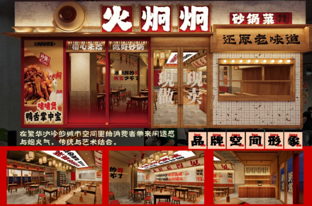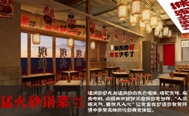 复古现代融合,用餐体验升级。 火炯炯砂锅菜的门店设计也独具匠心。品牌将复古元素与现代简约风格巧妙融合,营造出一种既温馨又时尚的用餐环境。店内温暖的灯光、复古的装饰、以及现场烹饪的香气,共同营造出一种独特的氛围,让食客在品尝美食的同时,也能享受到愉悦的用餐体验。